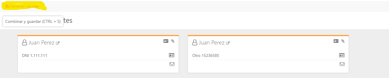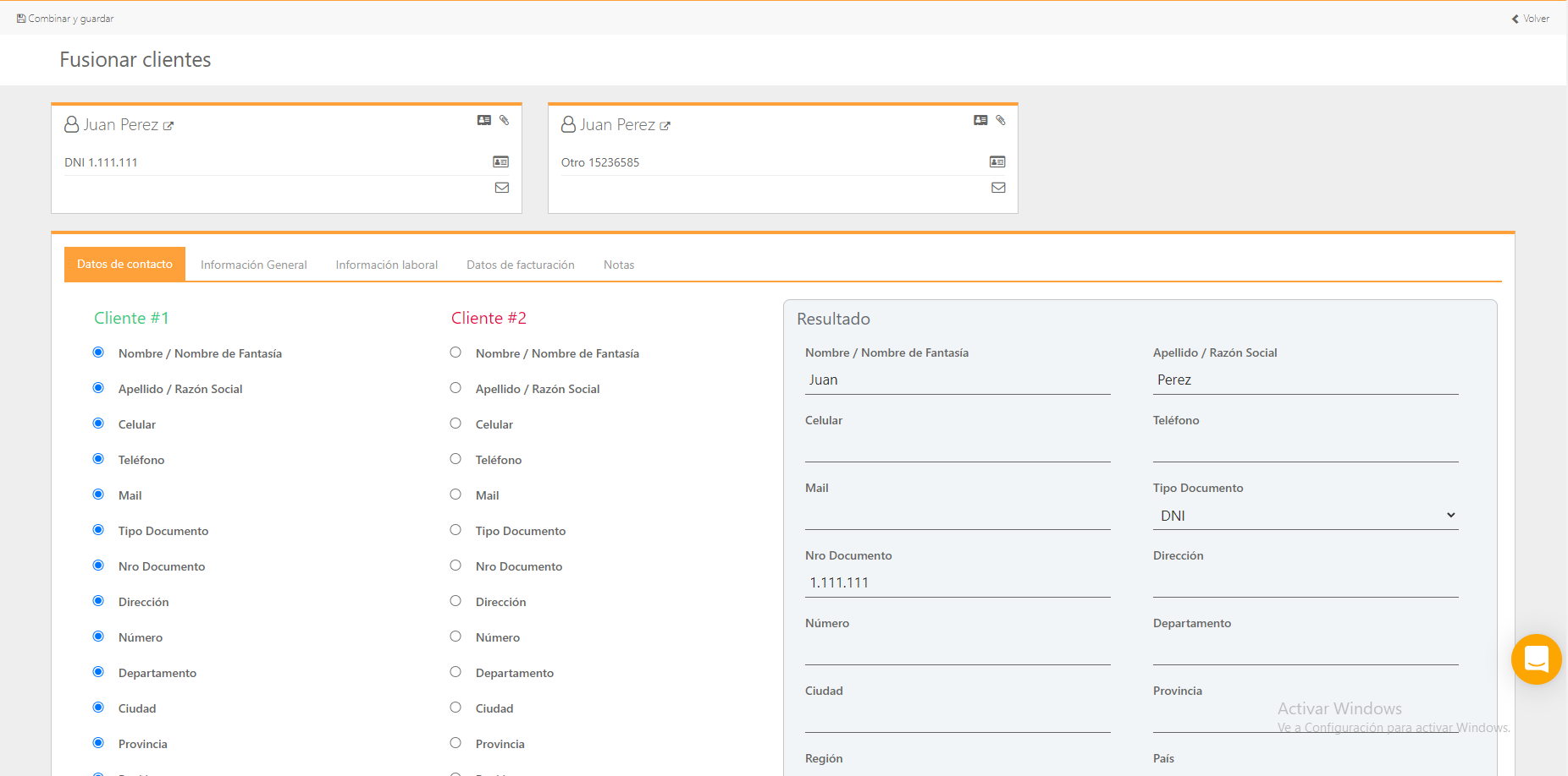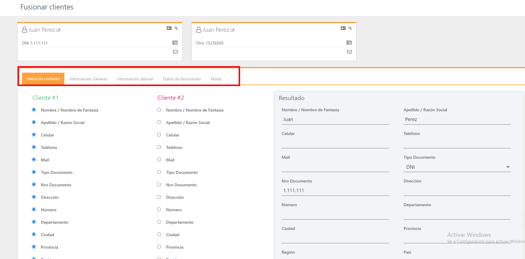 4. Quando clicamos em «Fundir clientes», aparecerá uma guia que nos pedirá para escolher sobre qual serão aplicadas as alterações. Aí, escolheríamos aquele que tem menos informações carregadas, se essa opção existir, embora na próxima tela possamos ver mais opções.
