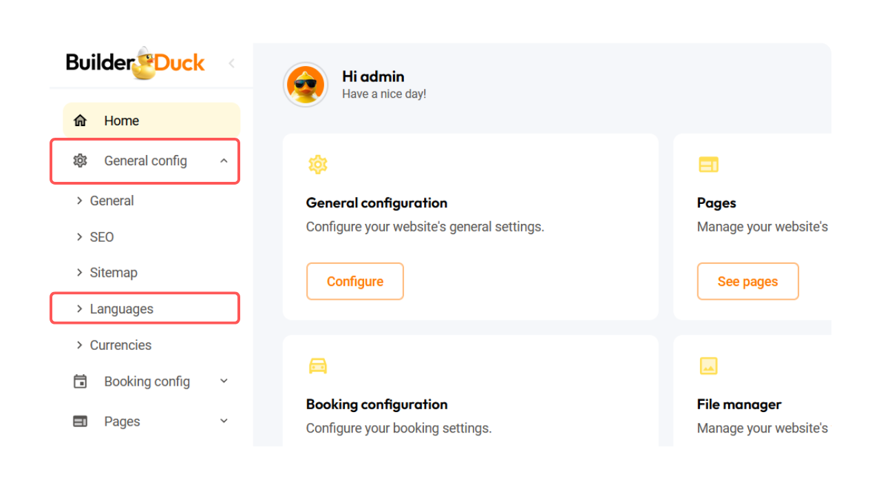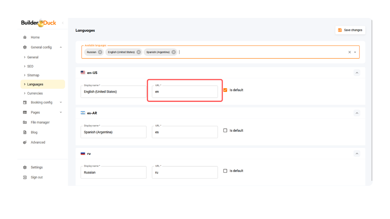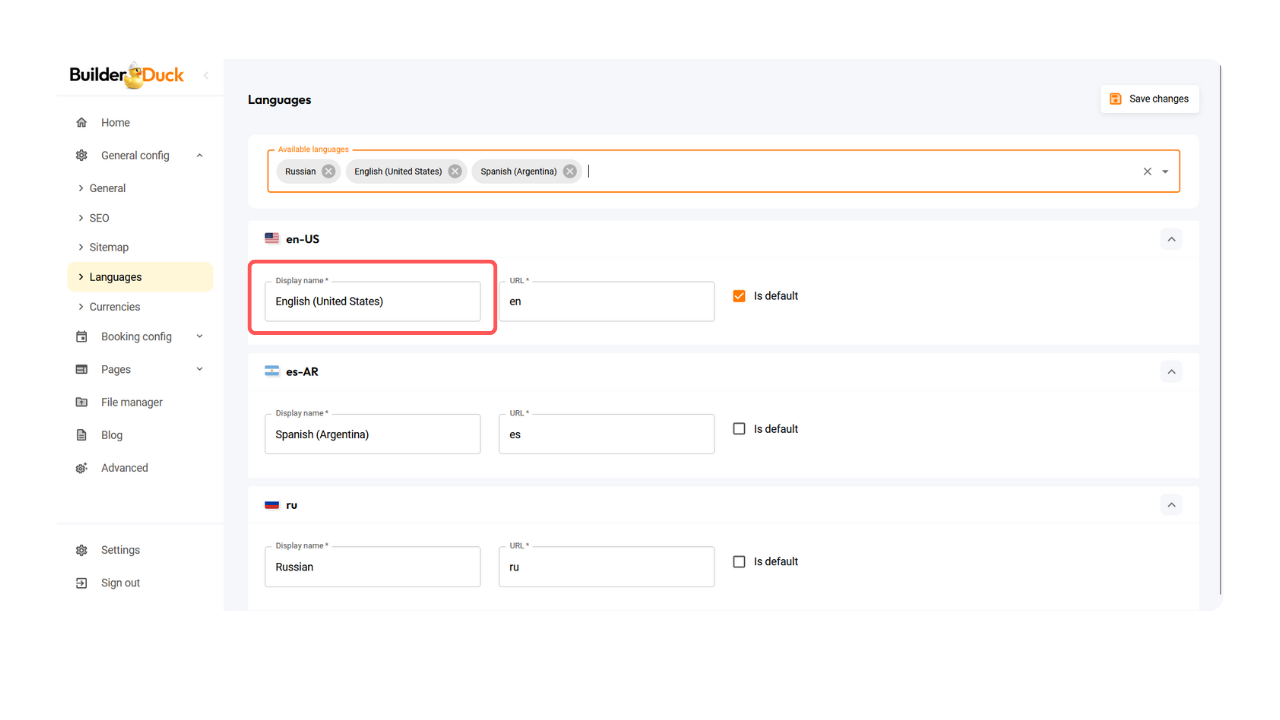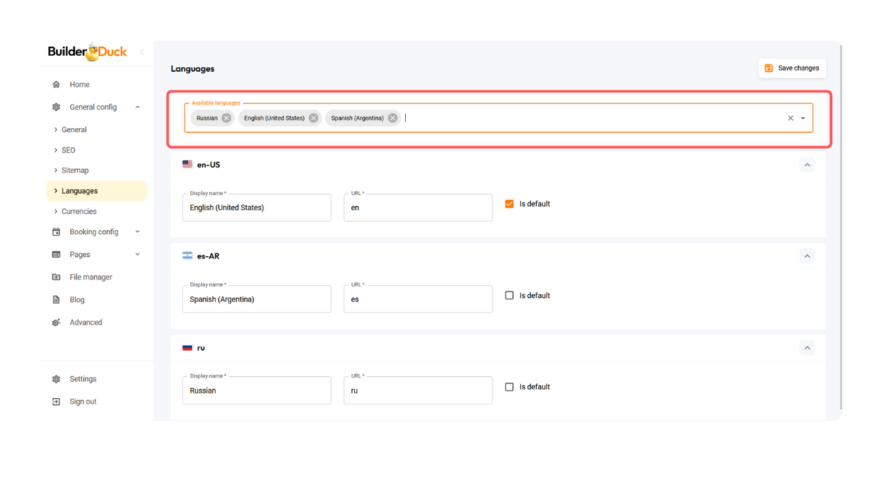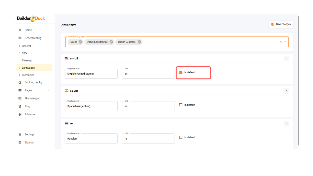 Com o BuilderDuck, você pode escolher os idiomas nos quais seu site estará disponível.