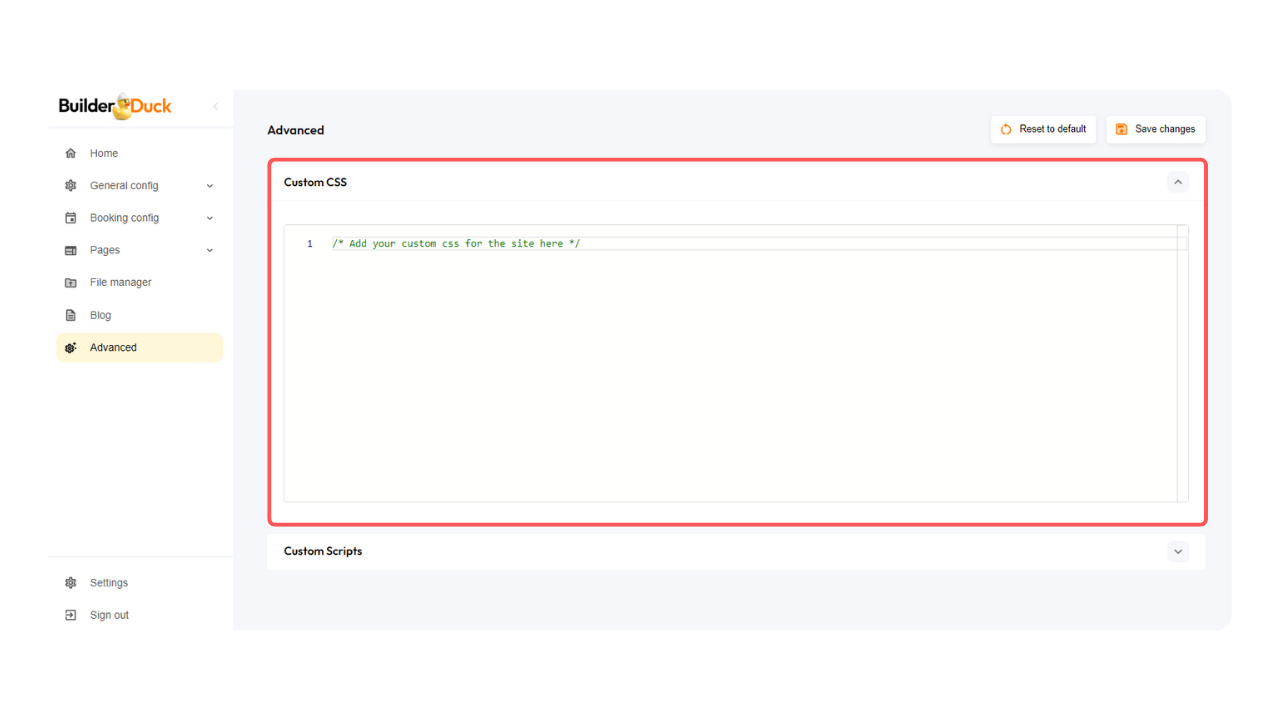 Se você deseja personalizar seu site além das opções disponíveis nas configurações do BuilderDuck, pode fazê-lo usando CSS.