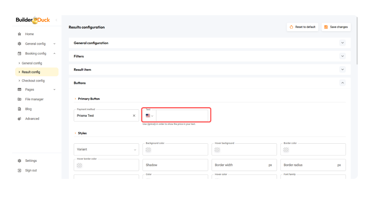No campo seguinte, você pode personalizar o texto do botão. Se você usar , o preço da reserva será exibido no seu texto.