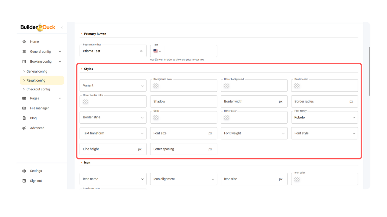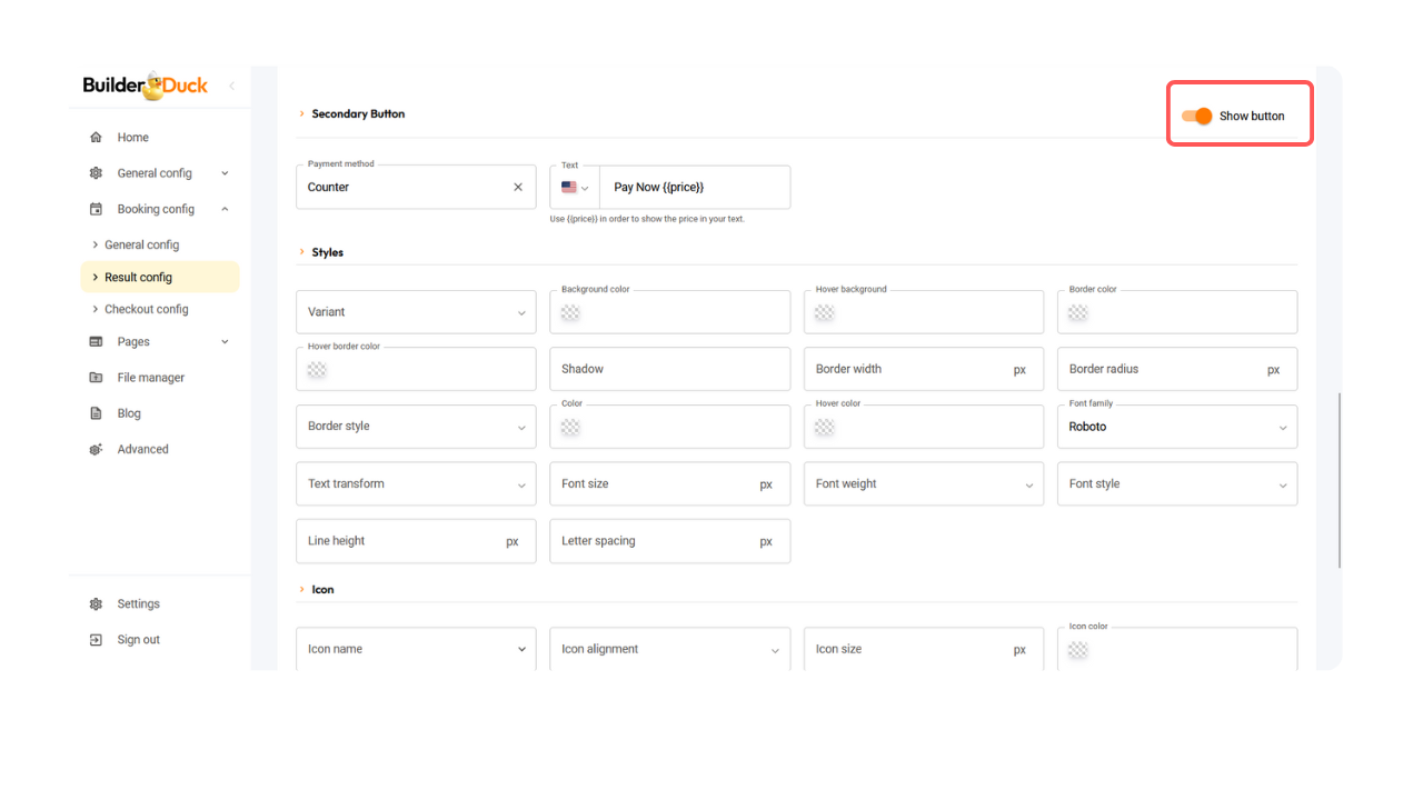 Use o BuilderDuck para vincular um botão a um método de pagamento, personalizar seu texto e estilo, adicionar um segundo botão e incluir ícones.