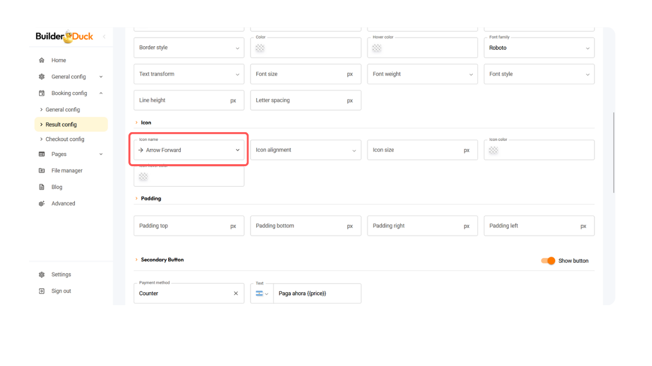 Você também pode adicionar um ícone ao seu botão. No menu suspenso “Nome do ícone”, selecione o ícone desejado.