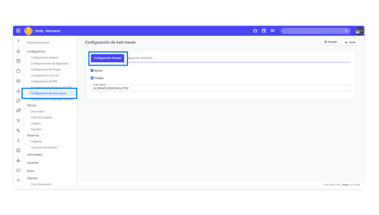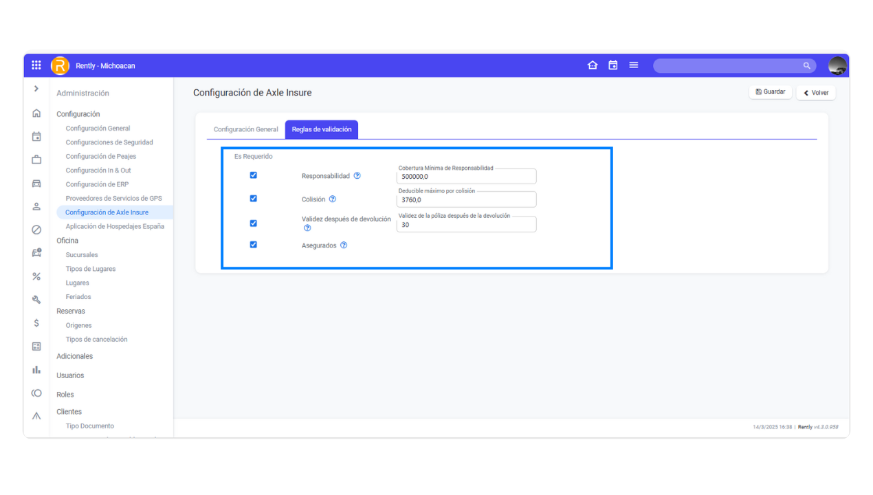 Quando Axle estiver ativada, você deve configurar os parâmetros de cobertura de seguro exigidos pela locadora de veículos. Para isso, acesse Configurações Gerais e selecione Configurações de Seguro da Axle. Lá, clique na guia Regras de Validação.