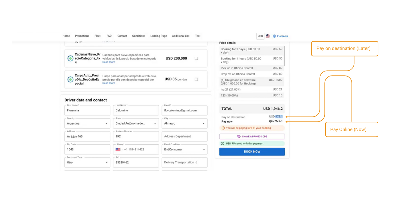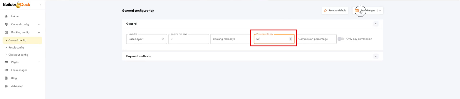Se você tiver um site criado com o BuilderDuck, poderá configurar qual porcentagem das reservas os usuários devem pagar ao fazer a reserva online e quanto eles devem pagar no local da reserva.