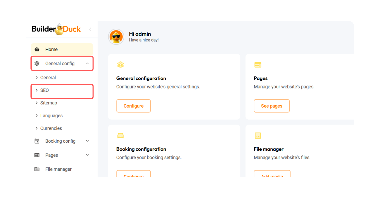 Acesse Configurações Gerais na barra lateral e selecione SEO.
