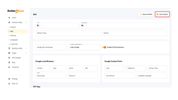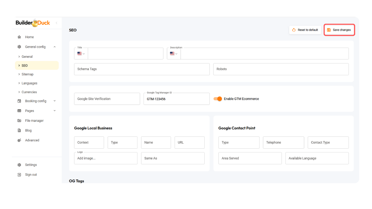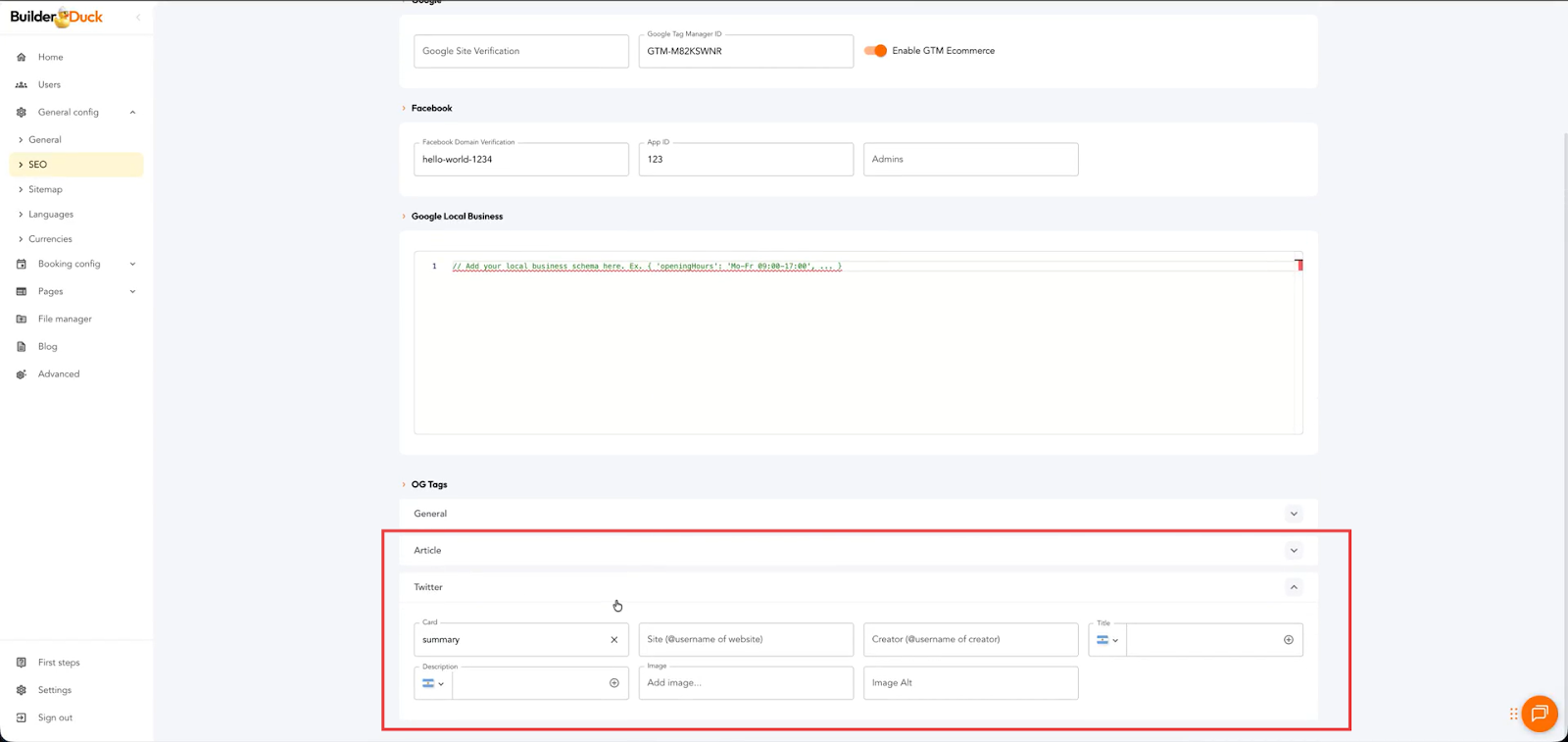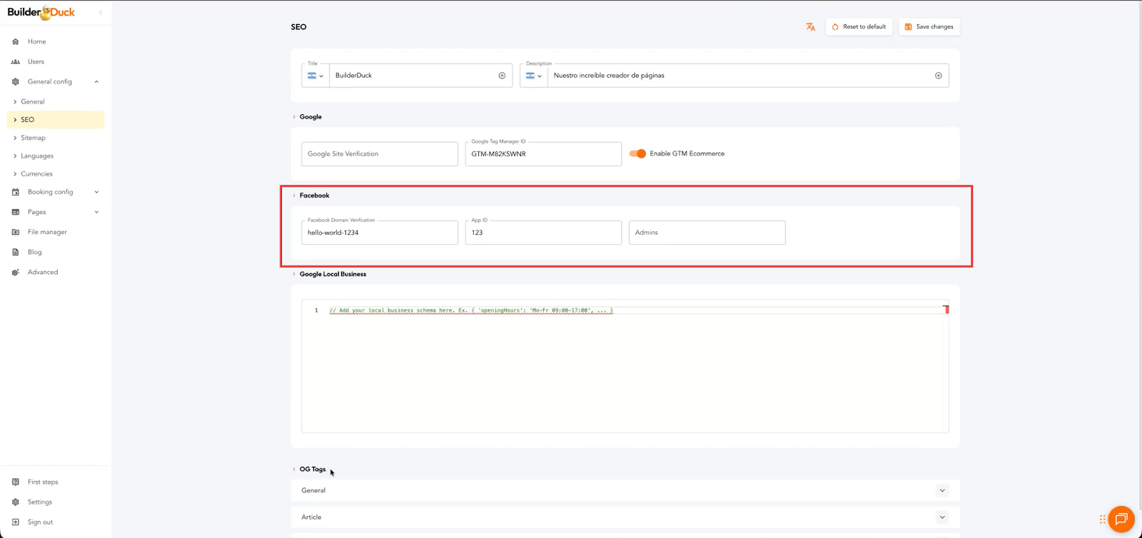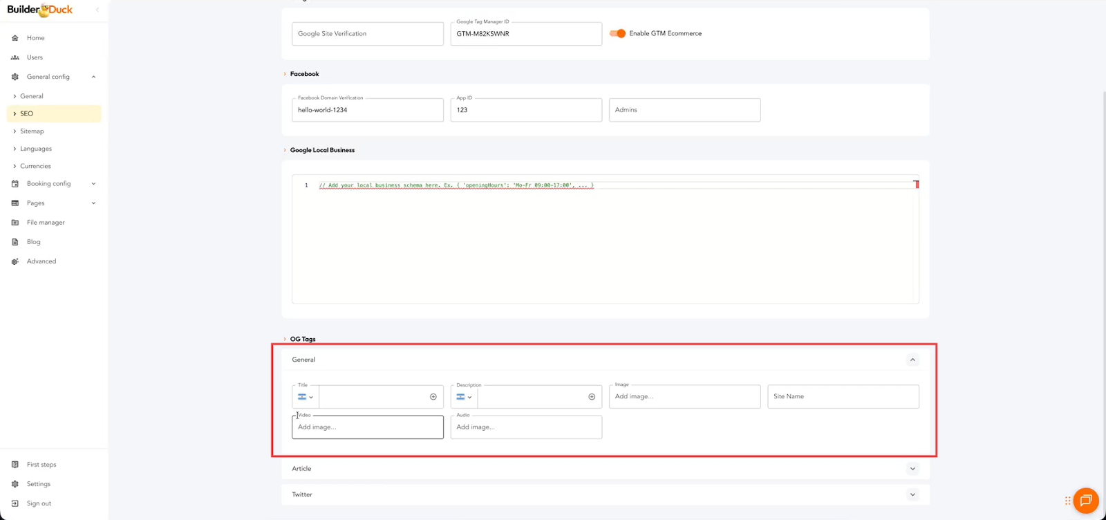Abaixo, você pode adicionar tags OG gerais abrindo o menu suspenso e inserindo as informações correspondentes nos campos.