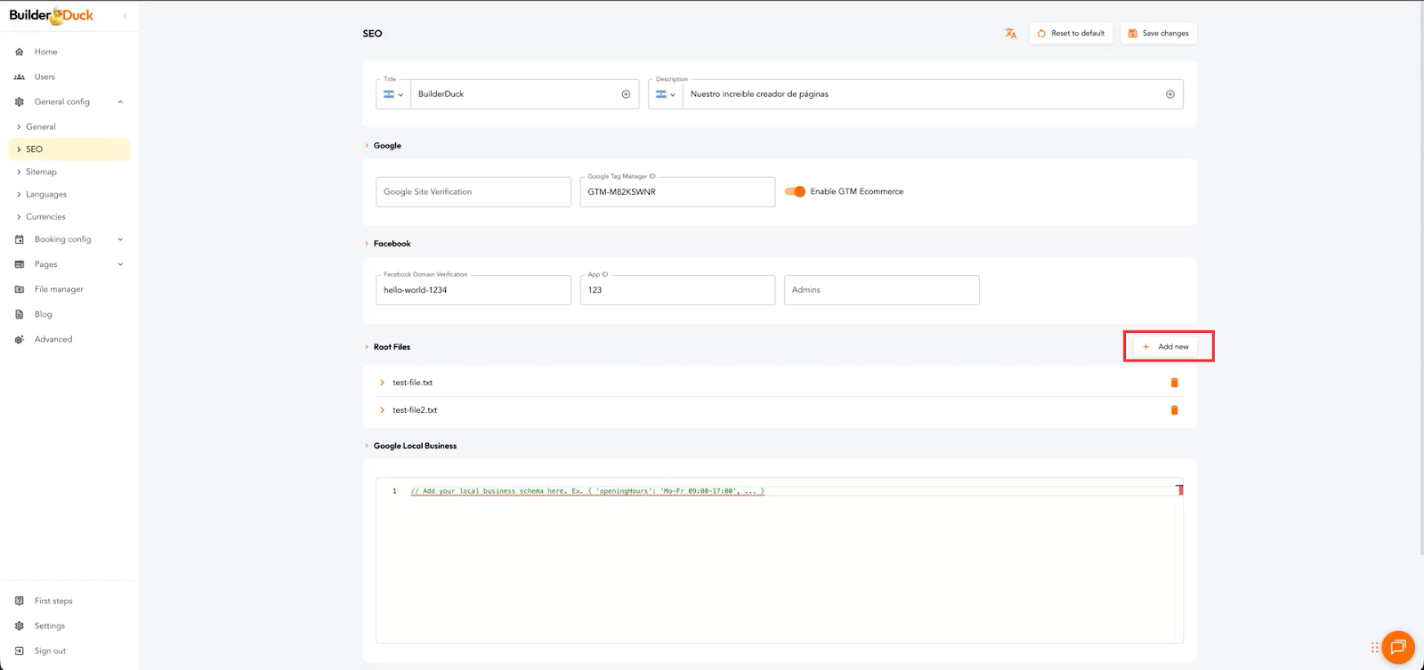 Para fazer upload de arquivos .txt e JSON (seja para instruções de IA ou SEO), acesse Arquivos Raiz e clique em Adicionar Novo.