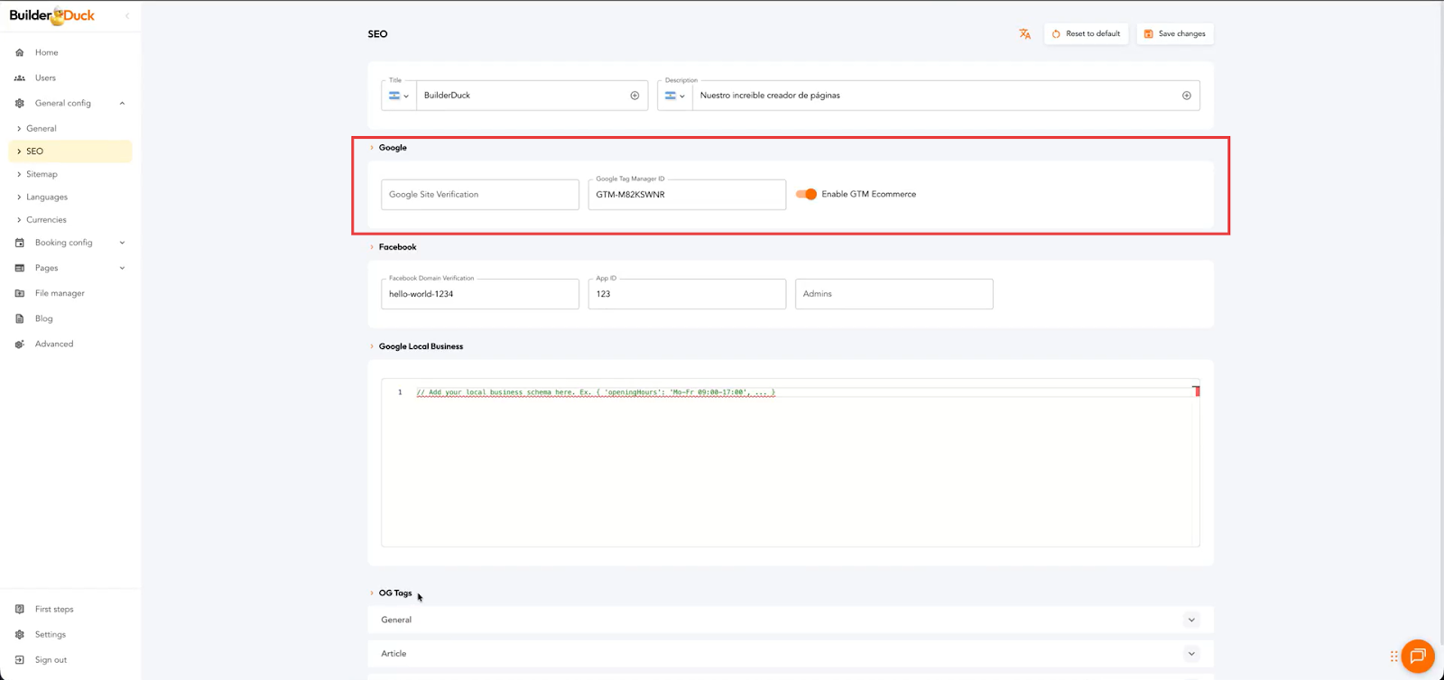 Como configurações adicionais (mas não obrigatórias) de SEO, você pode adicionar aVerificação do Site do Google, tuGerenciador de tags do Google e ativar o GTM Ecommerce.