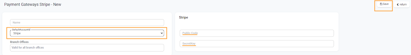 Por fim, preencha os campos Chave Pública e Chave Secreta com os valores obtidos no Stripe. Quando terminar, salve as alterações.