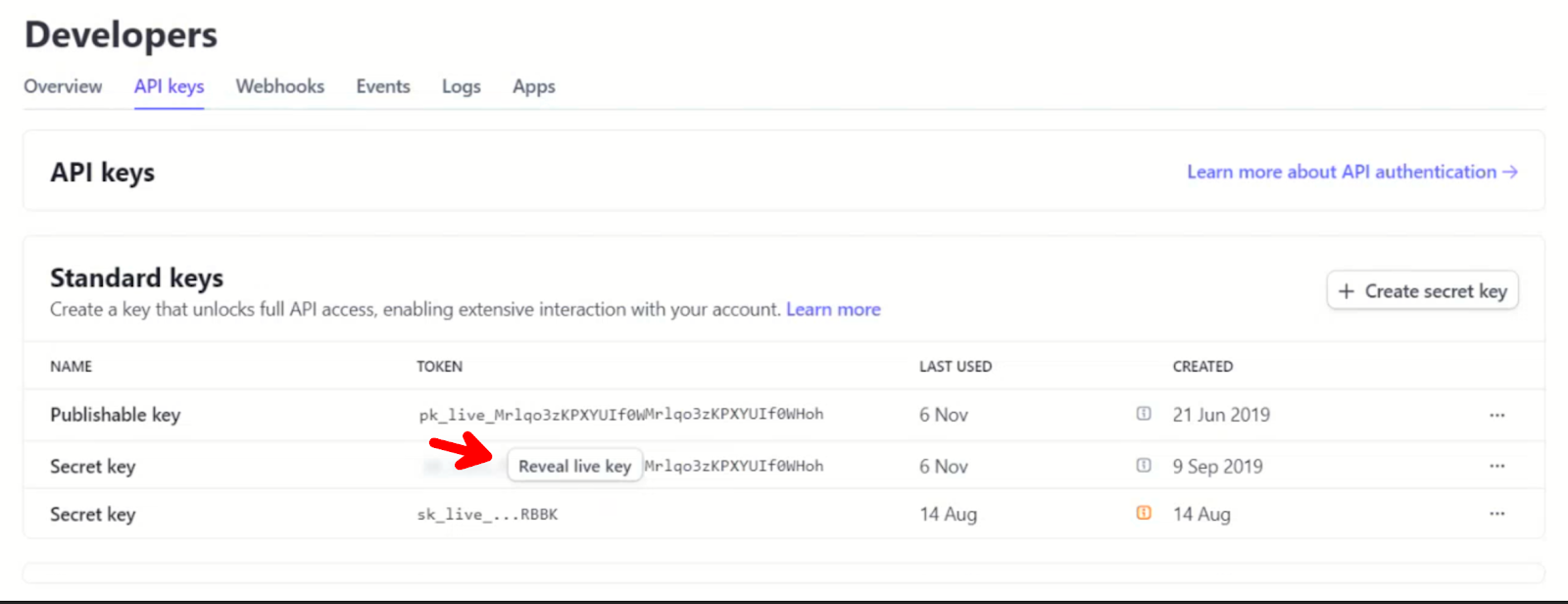 - Você verá suas chaves API “Teste” e “Ao vivo”. Para ver a chave secreta, clique no botão “Revelar token da chave ao vivo” ao lado da chave Ao vivo. Para ver a chave pública, basta copiá-la do painel de controle.