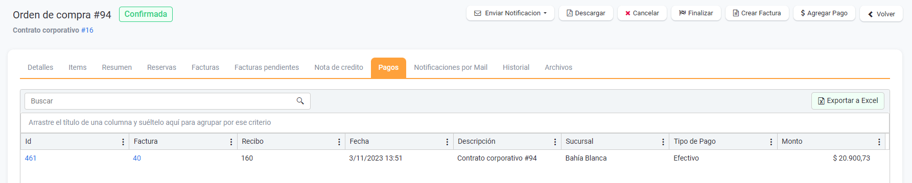 Após a emissão das faturas, você pode associar pagamentos a elas usando a ação "Adicionar Pagamento".