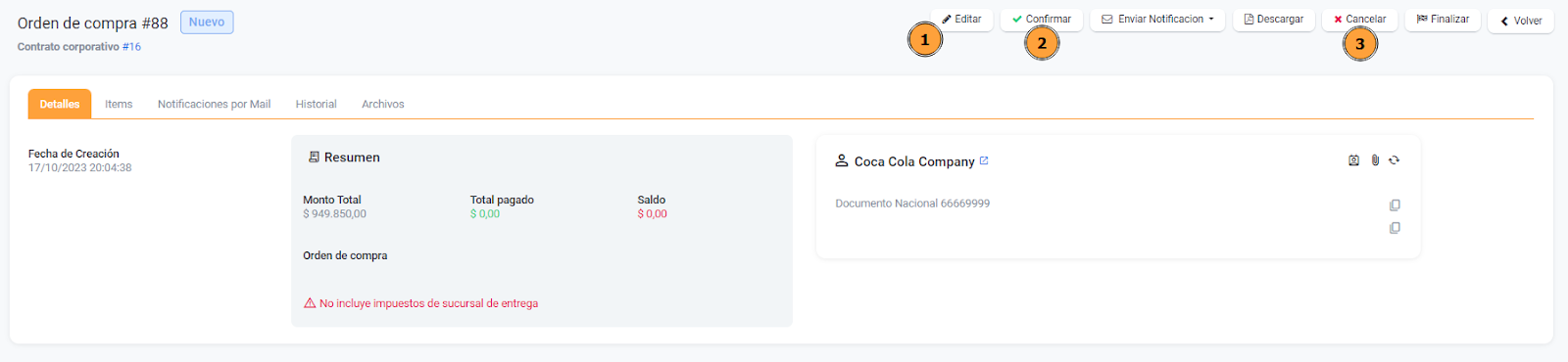 Após a confirmação de um Pedido de Compra, novas abas serão exibidas com informações e ações atualizadas.