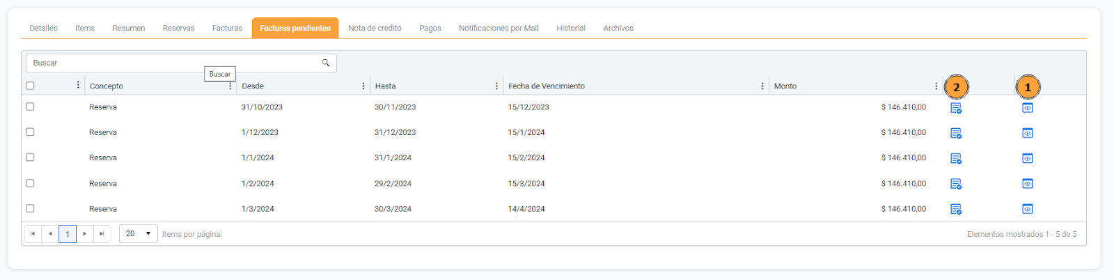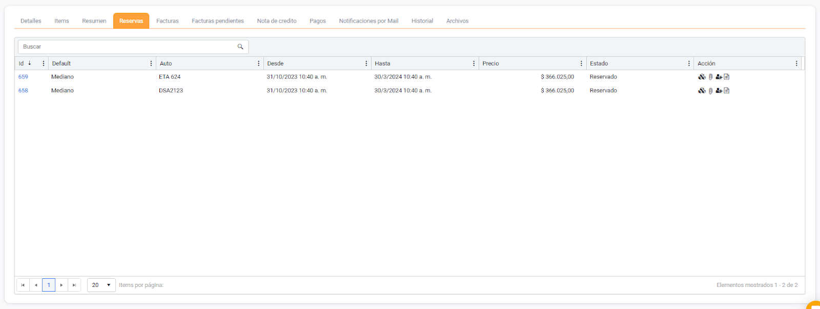 Nesta aba, você pode listar todas as reservas e realizar as seguintes ações usando os ícones disponíveis: