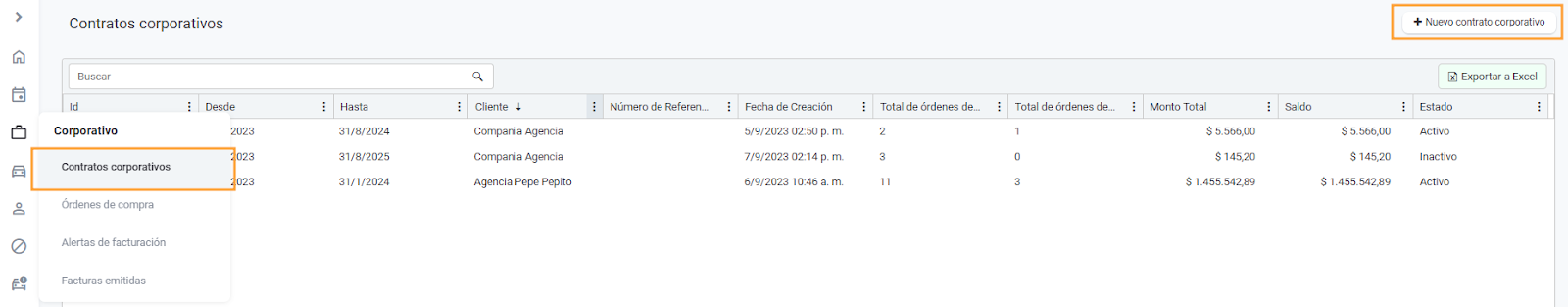 O item Contrato Corporativo representa o período de vigência do acordo com um Cliente/Empresa; ou seja, haverá apenas um Contrato Corporativo com o mesmo cliente, exceto nos casos em que houver acordos separados (períodos de tempo diferentes ou com condições/informações de faturamento diferentes).