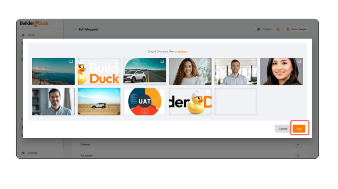 Clique no campo "Adicionar imagem" para adicionar uma imagem à postagem do blog.