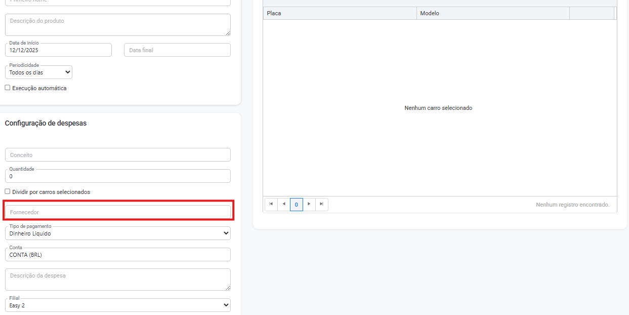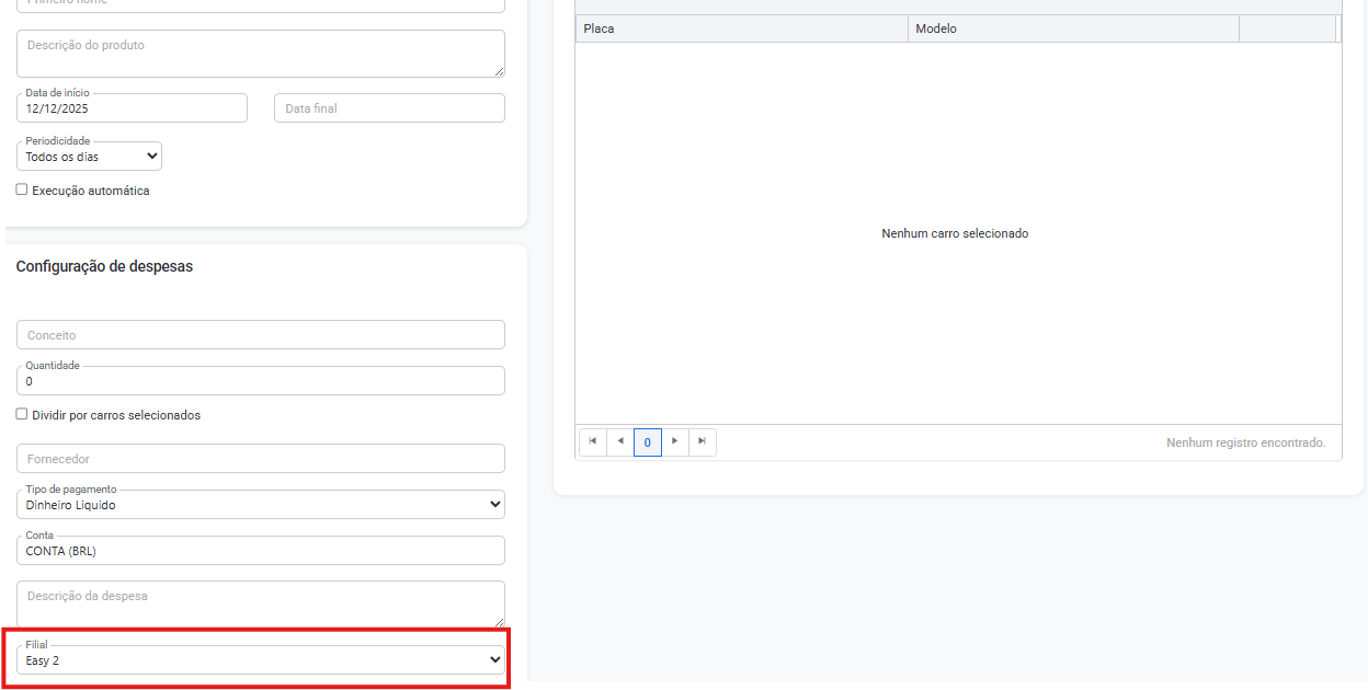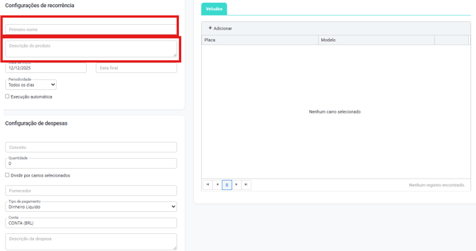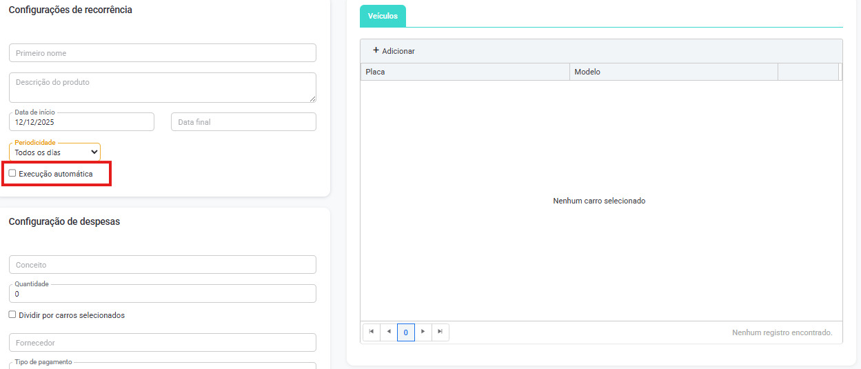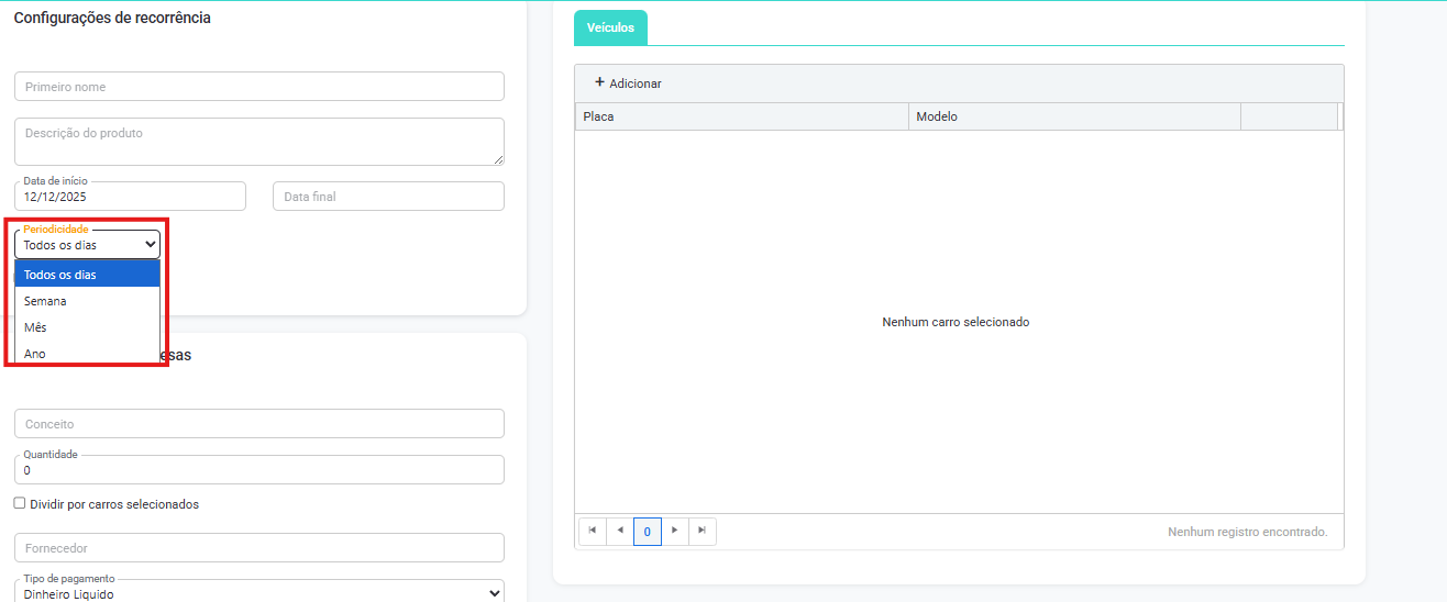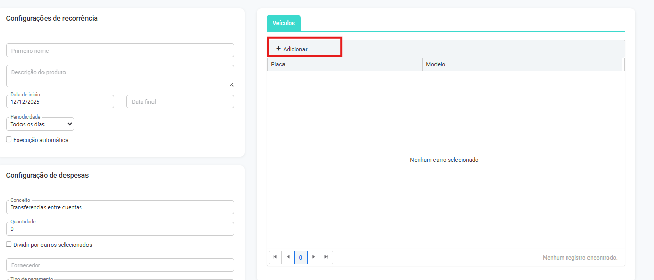 Por último, adicione os carros aos quais deseja associar a despesa recorrente. Basta pressionar o botão Adicionar e selecionar a placa do carro. É possível adicionar mais de um carro à despesa recorrente.