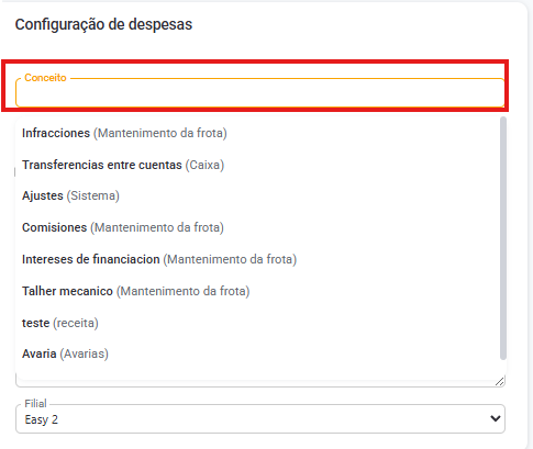 Em seguida, você encontrará a seção Configuração da despesa. A partir daí, primeiro selecione o conceito no menu suspenso! Algumas opções como: