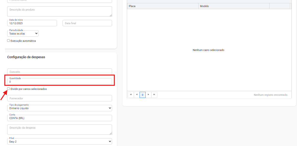 Abaixo, você pode marcar se deseja dividir esse valor pelos carros selecionados.