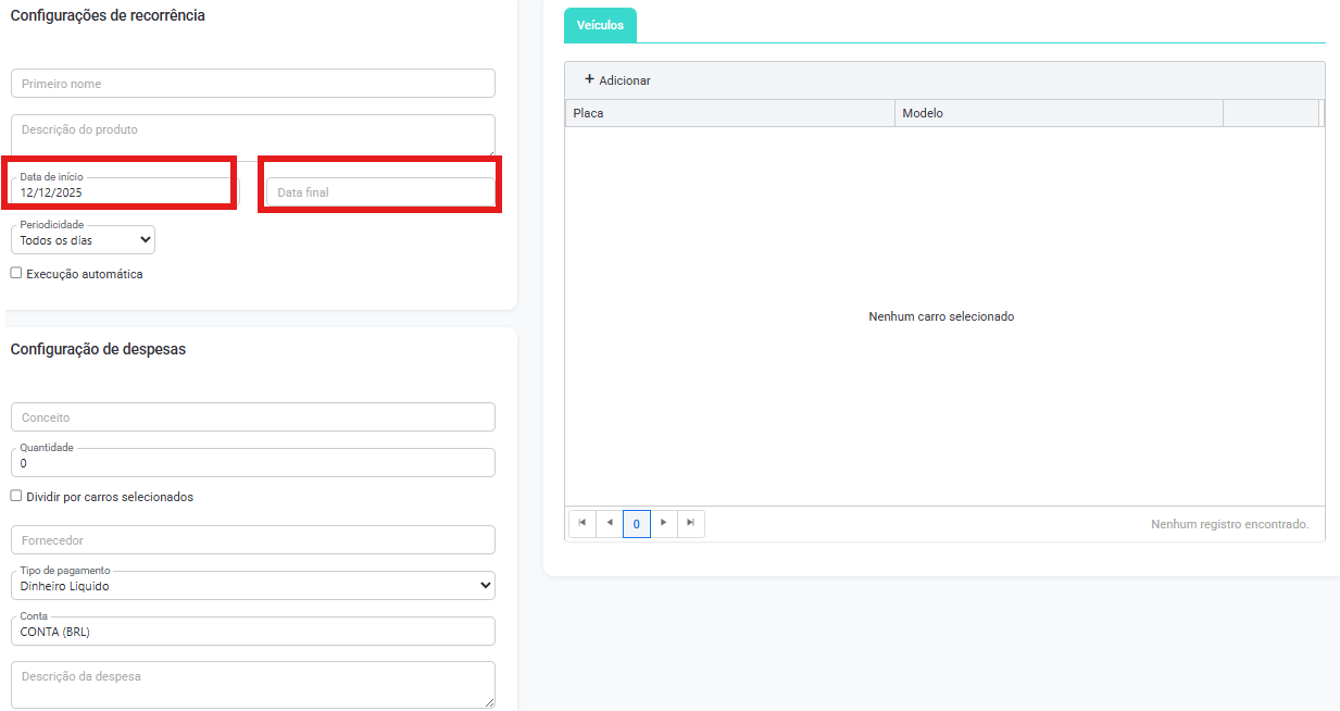 Abaixo, selecione a data de início da despesa recorrente. Você também pode selecionar a data de término (mas isso é opcional). Caso não selecione uma data de término, o sistema marcará a despesa como contínua.