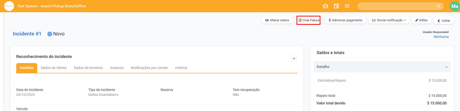 Após preencher o formulário de incidentes e salvá-lo, você encontrará a página de acompanhamento, onde poderá criar uma fatura.