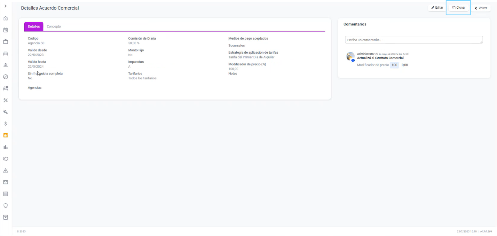 Você verá o botão Clonar. Clique nele para duplicar o acordo comercial.