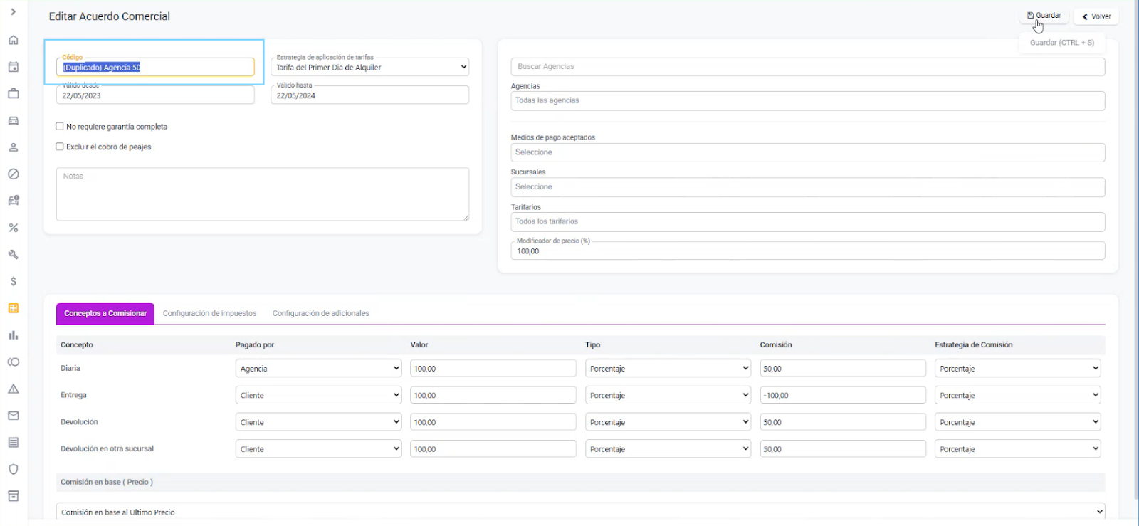 Para duplicar os acordos comerciais, você deve ir para Tarifas e selecionar Acordos Comerciais.