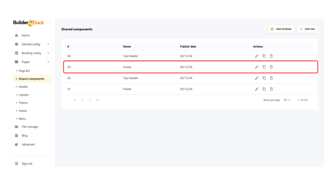 Você encontrará os componentes compartilhados atuais, incluindo o rodapé. Selecione o rodapé que deseja personalizar clicando no ícone de edição.