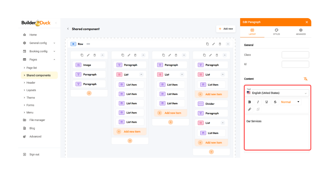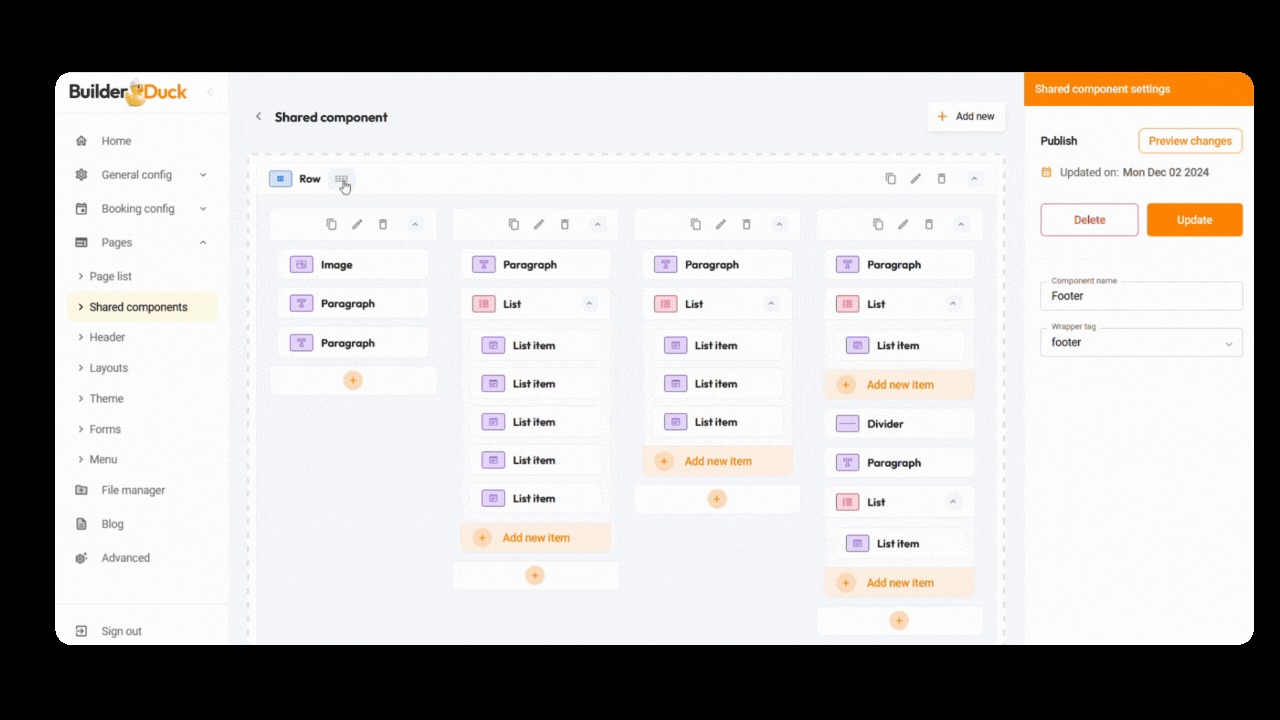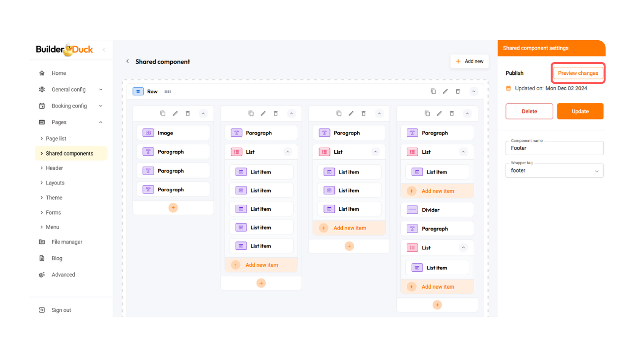 Com o BuilderDuck, você pode personalizar o rodapé. Para começar, acesse 'Páginas' e selecione 'Componentes compartilhados'.