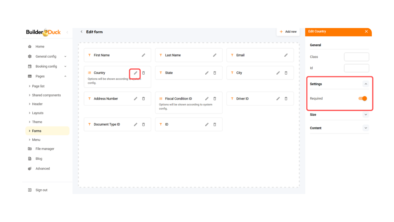 Clique no ícone Editar para personalizar o campo. Isso abrirá a barra lateral “Editar”, onde você pode marcar o campo como obrigatório ativando o botão na seção Configurações.