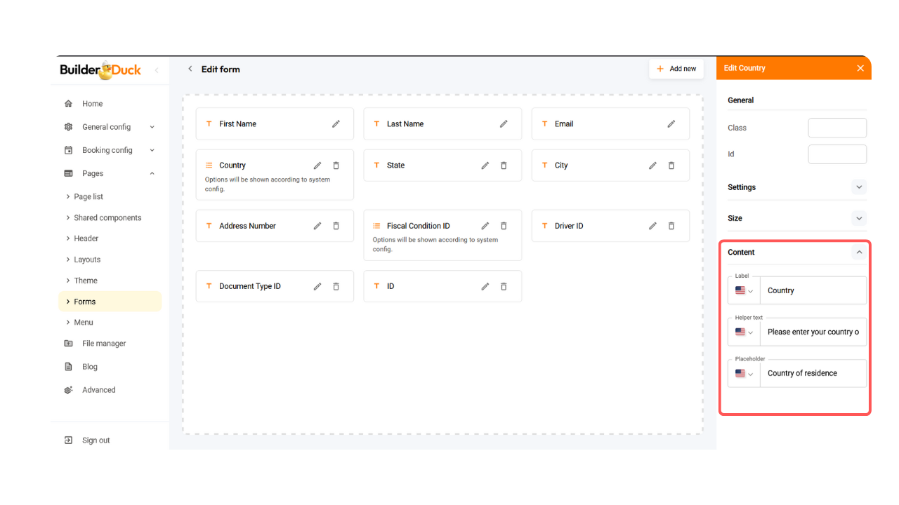Na seção Conteúdo, você pode alterar o Nome do Campo, adicionar um Texto de Ajuda e/ou adicionar um Marcador de Posição.