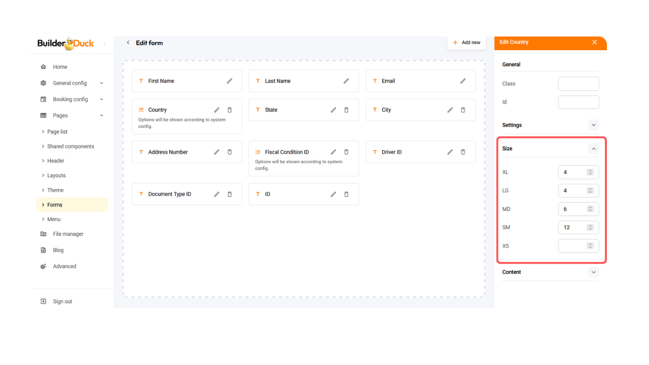 Você também pode alterar o tamanho do campo na seção Tamanho.