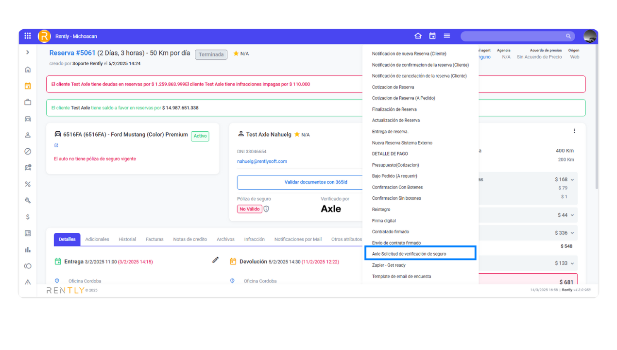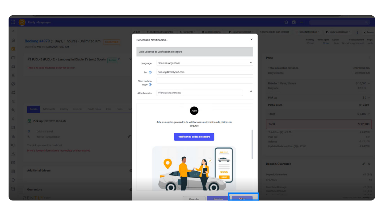 Quando um cliente faz uma reserva, você pode enviar um e-mail para confirmar se o seguro dele atende aos requisitos da sua locadora de veículos. Para isso, a integração com a Axle precisa estar ativada.