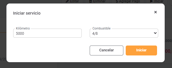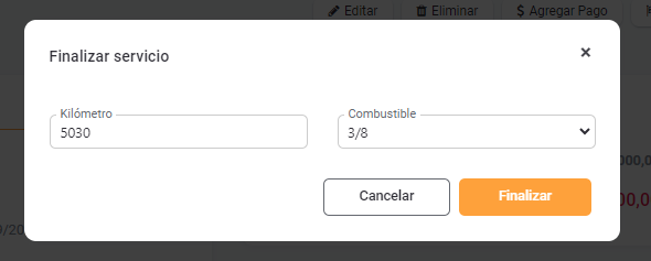 Ao clicar, aparecerá a seguinte janela pop-up, na qual devemos indicar os quilômetros e o combustível com que o veículo saiu do serviço.