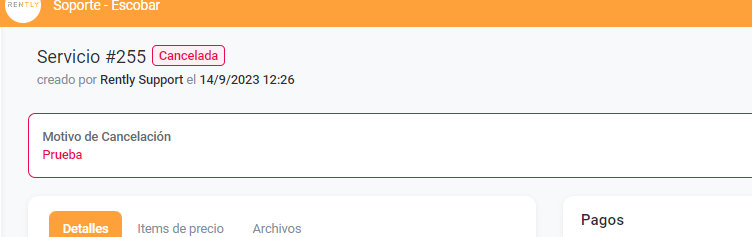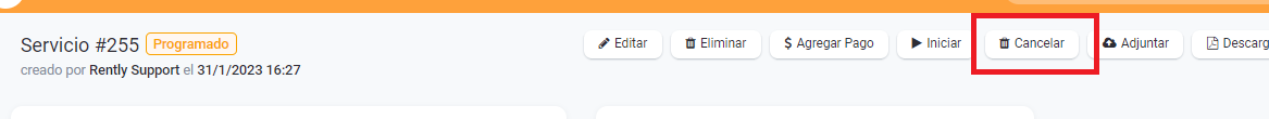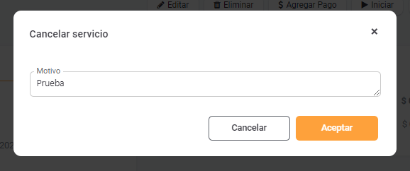 Se quisermos cancelar um serviço, clicamos em “Cancelar” e inserimos o motivo do cancelamento.