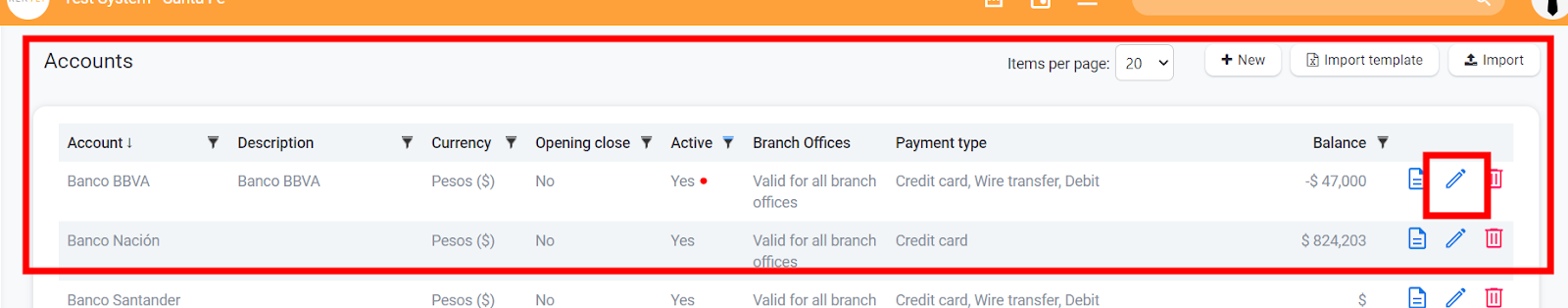 - Na seção de contas, acessaremos a opção "editar" da conta que desejamos modificar: