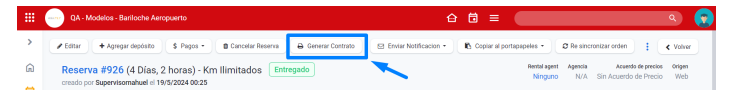 1- Acesse a reserva: acesse a reserva correspondente e selecione a opção “Gerar contrato”.