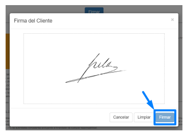 Confirmação da assinatura: Depois de o cliente assinar, clique em «ASSINAR» para guardar a assinatura no sistema.