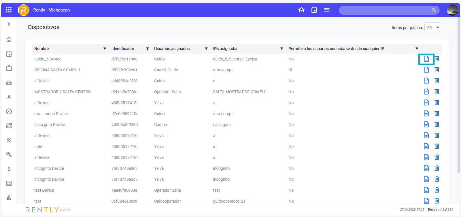 Lá você encontrará os dispositivos com acesso ao Rently. Toque no ícone do documento para obter mais detalhes.