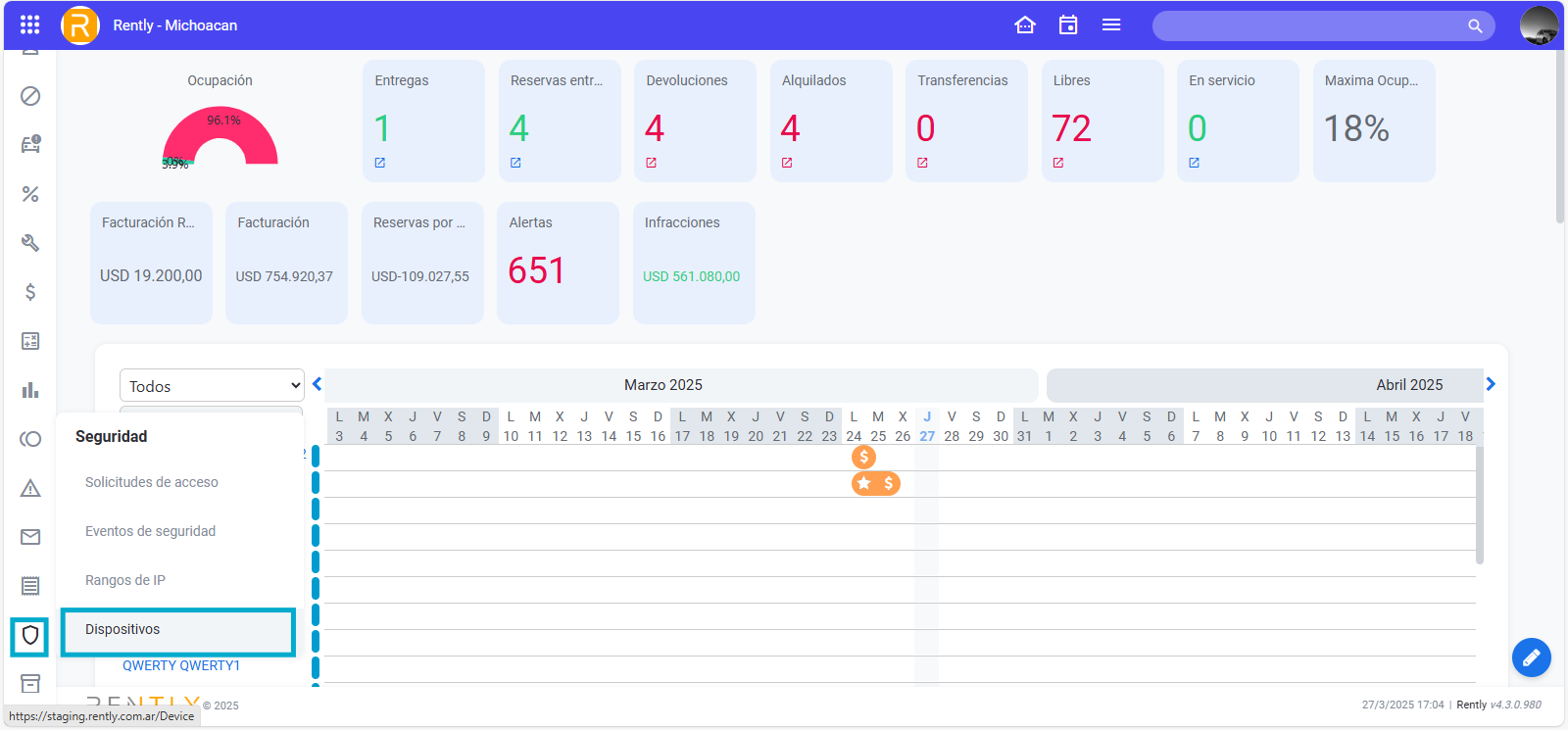 Quando o módulo de segurança estiver ativado, você poderá gerenciar o acesso ao Rently por dispositivo. Para isso, acesse Segurança na barra lateral e selecione Dispositivos..