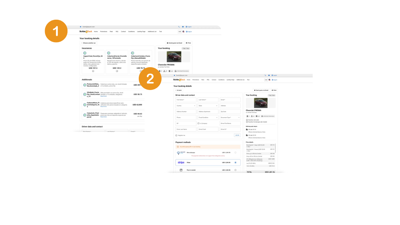 Os usuários poderão selecionar o seguro e quaisquer opções adicionais na primeira etapa e, em seguida, preencher suas informações e confirmar a reserva.