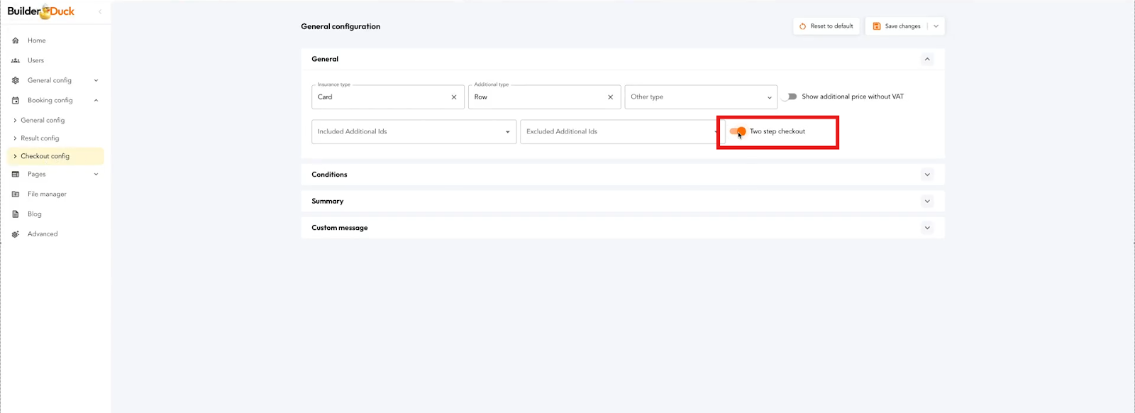 Ali, ative a chave para habilitar o checkout em duas etapas.