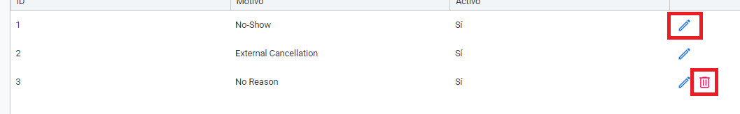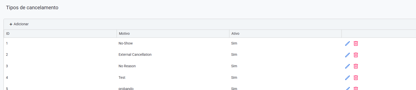 Se precisarmos modificar o motivo de um tipo de cancelamento já criado, devemos clicar na opção de edição (lápis) e, se quisermos eliminar um tipo de cancelamento, clicamos no ícone de eliminar: