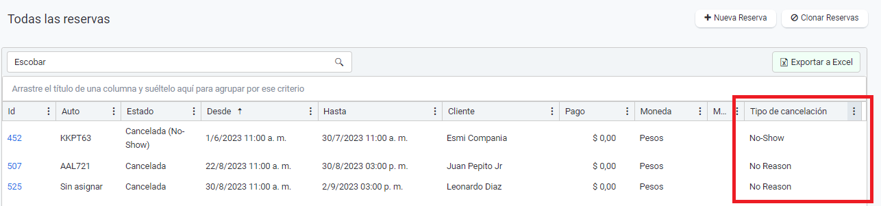 Na grelha «todas as reservas», poderemos aplicar o filtro Tipo de cancelamento.
