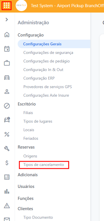 Se já tivermos a permissão habilitada, dentro da configuração no lado esquerdo, vamos acessar “Tipos de cancelamento”: