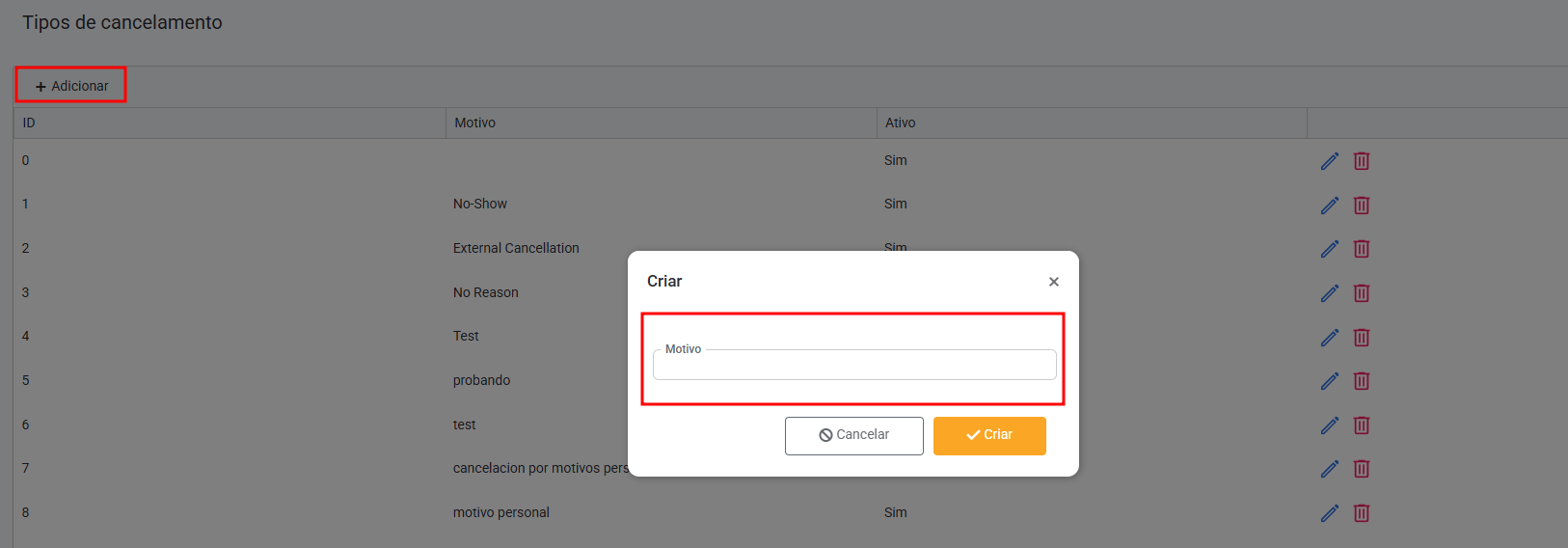 Se quisermos adicionar um novo tipo de cancelamento, clicamos em “+ Adicionar” e inserimos o motivo: