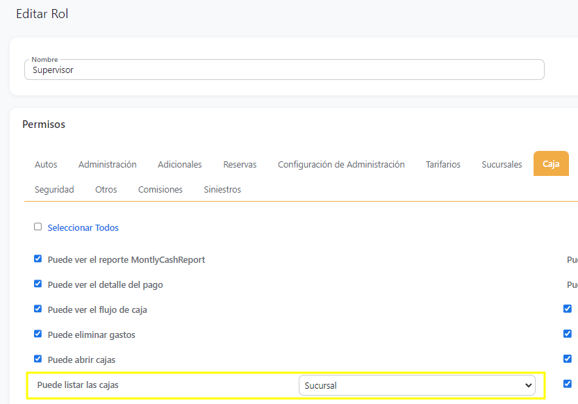 Na guia "Caixa", no campo "Pode listar caixas", selecione Filial ou Global.