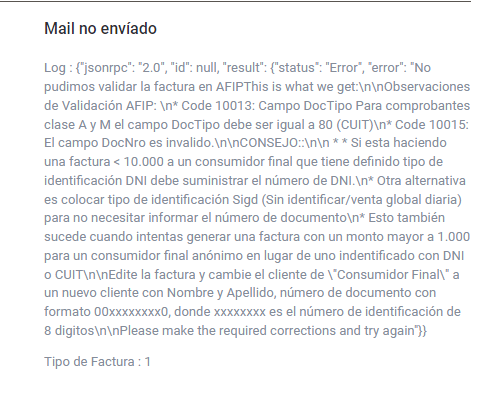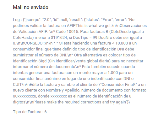 "An error occurred when requesting the credit note XXXX. Details: {"jsonrpc": "2.0", "id": null, "result": {"status": "Error", "error": "We couldn't validate the invoice \"CLIENTE\" (Draft Invoice XXXXXX) in AFIPThis is what we get:\n\nAFIP Validation Observation: \n Code 10013: Campo DocTipo Para comprobantes clase A y M el campo DocTipo debe ser igual a 80 (CUIT)\n* Code 10015: El campo DocNro es invalido.\n\nHINT:\n\n * * If you are making an invoice < 10.000 to an final consumer who has DNI as identification type you must provide the DNI number.\n * Another alternative is to set Sigd (Unidentified / daily global sale) Identification type in order to do not need to inform the Document number,\n * This also happens when you try to generate an invoice with amount greater than 1.000 to an Anonymous Final Consumer instead of one identified with DNI or CUIT.\n\nEdit the invoice and change the partner from \"Final Consumer\" to a customer with First and Last Name, document number with format 00xxxxxxxx0, where xxxxxxxx is a an eight-digit document number\n\nPlease make the required corrections and try again"}}"