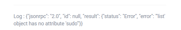 Log : {"jsonrpc": "2.0", "id": null, "result": {"status": "Error", "error": "'list' object has no attribute 'sudo'"}}