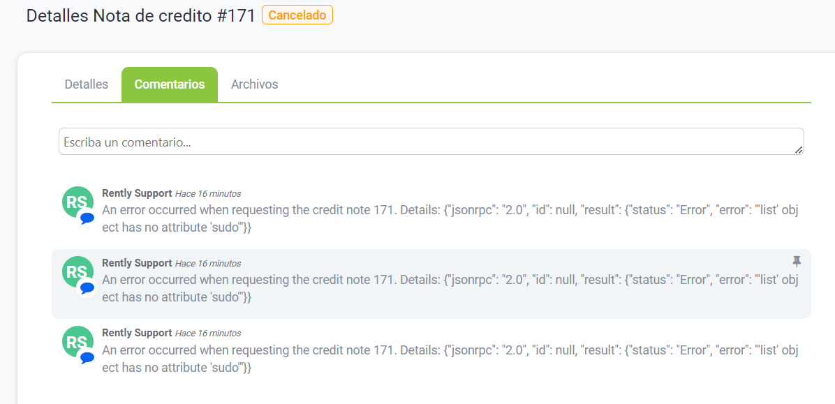 Verifique no Odoo se não há uma Nota de Crédito em estado “rascunho”; se houver, cancele-a e tente novamente no Rently.