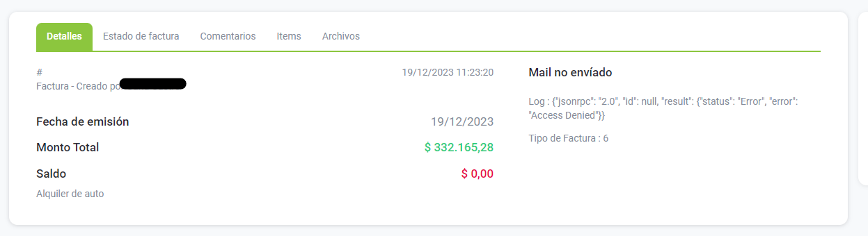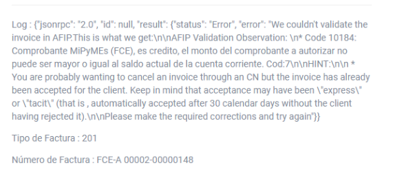 - A fatura foi emitida há mais de 30 dias e a AFIP não permite a Nota de Crédito. Quando isso acontecer, informe que eles devem entrar em contato com a Codize /odoo.